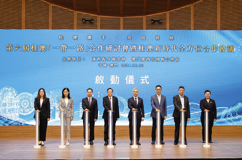 2024年8月21日,第六届桂澳“一带一路”合作研讨会暨桂澳新时代全方位合作会议启动仪式在澳门科学馆举行,图为嘉宾主礼开幕式。
