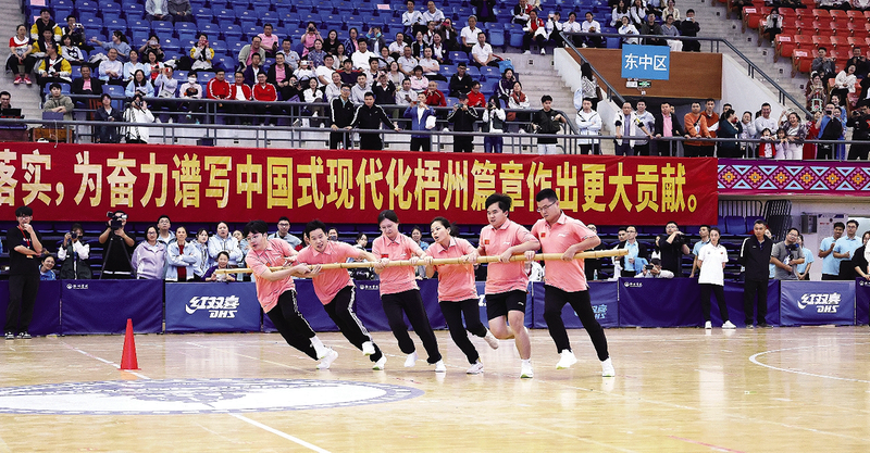 梧州市坚持以铸牢中华民族共同体意识为主线,持续举办以民族团结进步为主题的体育盛会,弘扬传承中华民族传统体育文化,营造大团结大联合浓厚氛围。图为2024年11月22日至24日,运动员在梧州市第四届统一战线民族团结进步职工运动会上进行“齐心协力”项目的比拼。 (本报通讯员 莫丽娜/摄)