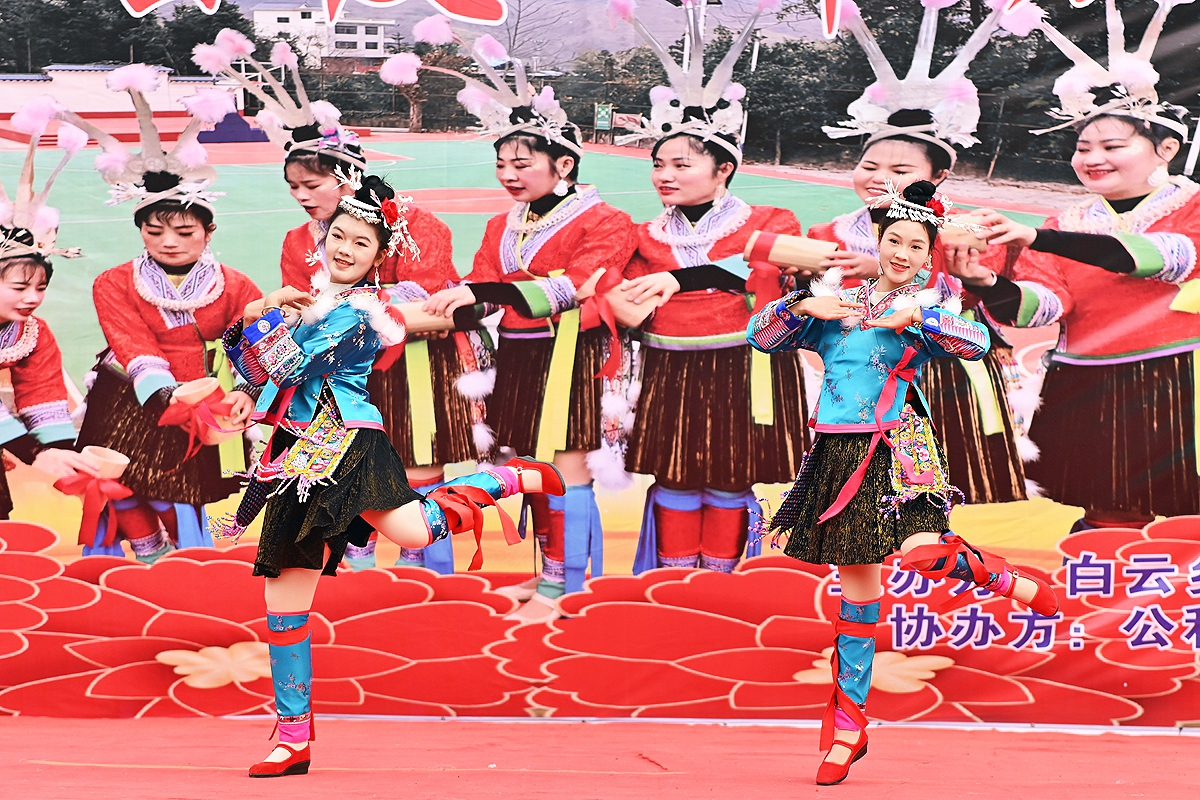 近日,融水苗族自治县白云乡公和苗寨举办“迎新春民族舞交流活动”,来自附近乡镇和三江侗族自治县等 支各族舞蹈队参加,现场各族群众身着盛装,以舞会友竞展舞姿,在欢声笑语中喜迎农历新年到来。图为活动现场。 (本报通讯员 兰堃摄影报道)