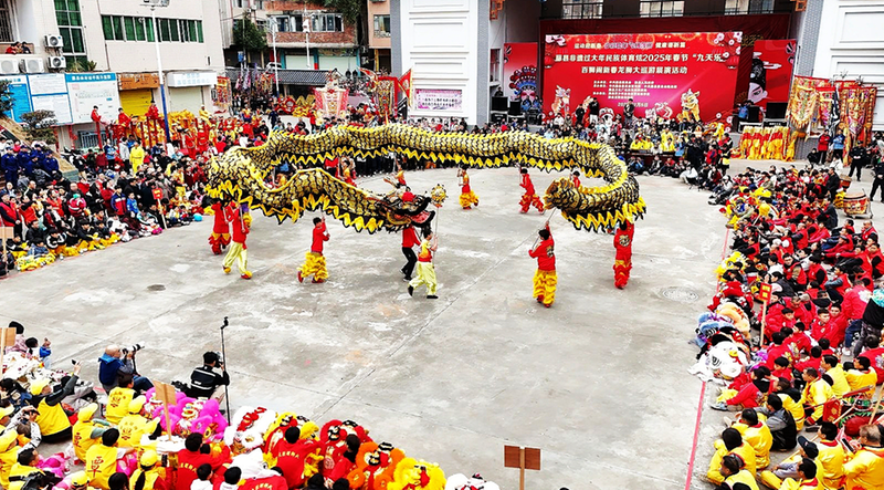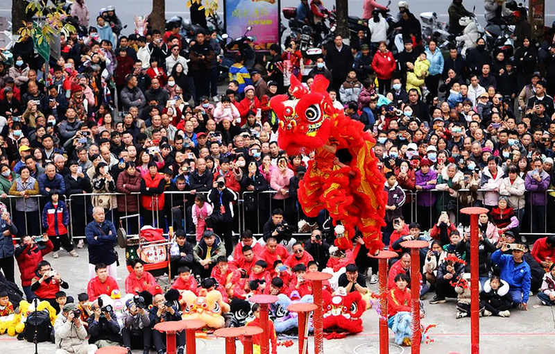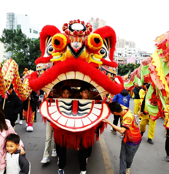 2月5日,藤县举办“百狮闹新春 龙狮大巡游”活动。本次活动共有13条雄龙、100 余头雄狮以及武术队方阵、牛歌戏队方阵等表演队伍。据了解,藤县春节龙狮大巡游已经连续举办3年,本届活动共500多名表演者参加,其中年纪最长者78岁,最小者仅为5岁,吸引了万余名各族群众沿途观赏,网络观看人数超20万。图为活动现场。