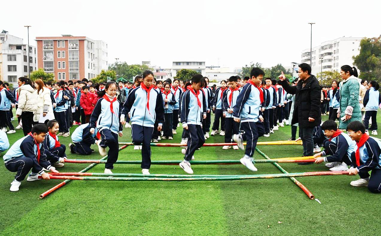 近日,宾阳县和宾彰泰小学开展以“民族团结共进 和美同心致远”为主题的 年春学期开学第一课暨铸牢中华民族共同体意识主题实践活动。图为学生们在体验竹竿舞项目。 (本报通讯员谭洁芳 卢丽红 谭洁容摄影报道)