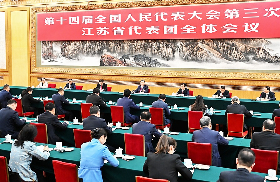 在听取大家发言后,习近平作了发言。他首先表示赞成政府工作报告,对江苏工作予以肯定,希望江苏落实好挑大梁的责任,努力取得新的更大成绩。