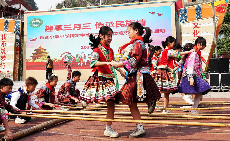 3月26日,融水苗族自治县苗家小学举行“趣享三月三 传承民族情”铸牢中华民族共同体意识主题教育活动,各族青少年在芦笙踩堂、情景山歌对唱、民族趣味运动项目展示等民族文体活动中感受民族文化的独特魅力。图为孩子们身穿民族服饰跳竹竿舞。 (本报通讯员 龙涛/摄影报道)