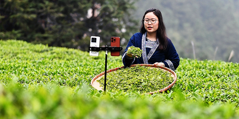 近日,融水苗族自治县红水乡举办首届茶文化节,通过采春茶比赛、茶园寻宝、茶艺展示、茶点制作、文艺表演等节目,让各族群众“零距离”感受传统茶文化的魅力,推动文旅融合发展,助力群众增收。图为网络主播在茶园进行现场推介。(本报通讯员 兰堃/摄影报道)