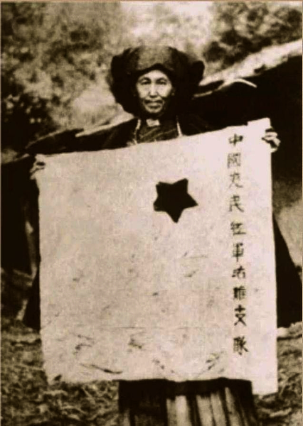 小叶丹的妻子倮伍伍加嫫手持中国夷渊彝冤民红军沽鸡渊果基冤支队队旗遥 (图片来源共产党员网冤 “彝海结盟”是中国共产党于长征途中于民族地区成功运用统一战线理论的一次壮举,不仅为红军其后强渡大渡河赢得了宝贵时间,而且为党的民族工作积累了重要经验。