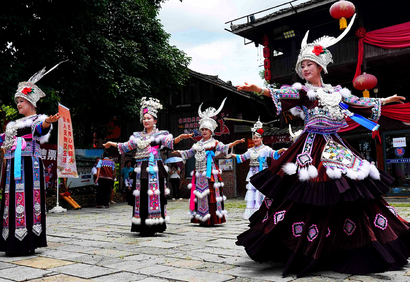 6月14日,柳州市举行“文化和自然遗产日”非物质文化遗产展示暨“染绎自然·非遗正青春”植物染系列展演活动,吸引众多游客前来观赏体验。图为融水苗族自治县梦呜苗寨苗家女展示民族服饰。