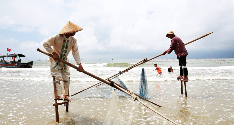 7月3日,东兴市京族哈节传统民俗仪式在金滩举行,活动通过民俗展演、文化交流、现场互动等多元形式,生动展现“中华民族一家亲”的和谐图景。图为京族群众向游客展示高跷捕鱼特色非物质文化遗产项目。 (本报通讯员 陈伟才方平/摄影报道)