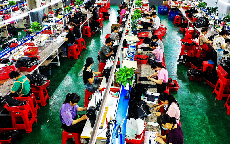今年以来,蒙山县聚焦企业用工需求,通过“线上+线下”双轨并行模式精准施策,利用“点对点送工”“技能培训赋能”等方式,助力企业稳岗扩产和民生改善。图为7月14日,蒙山县工业园区广西灵动鞋业有限公司车间内,工人们正在赶制订单。通过线上线下招聘平台,该公司首批已招募70名员工。