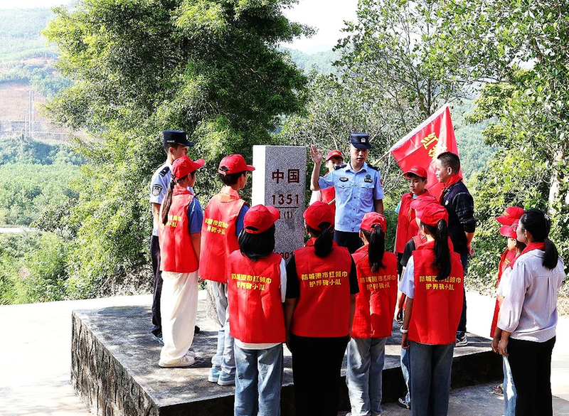 防城区那良镇滩散小学地处边境线,与越南仅一河之隔。自2001年起,该校率先成立了“红领巾护界碑小队”,并连续 24 年坚持开展护碑活动。这些活动不仅包括常规的学习实践,还结合特色体验,逐渐拓展为“我们家乡多美好”“我以叔叔为榜样”“中国梦·护碑梦”“争当护界碑小使者”等不同主题的教育活动,并通过建立《护界碑荣誉时刻》制度,创编护界碑歌、顺口溜和竹梆作品广泛宣传护碑行动。在滩散小学的示范带动下,那良镇边境一线的里火、大河、范河、民生、南里等 5 所小学也先后建立“红领巾护界碑小队”,联动开展“护界碑手拉手”活动,合力夯实护碑队伍。东兴市东兴镇也成立了“国门东兴青少年护界碑小队”,开展青少年“红动边城”护碑行动。防城港市将国防教育与爱国主义教育、传承红色基因、民族团结教育等紧密结合,贯穿于各级学校办学治校全过程,“护界碑”活动逐渐成为边境学校青少年爱国主义教育的必修课,有力促进边境各民族团结交融,维护祖国边境和平与稳定。