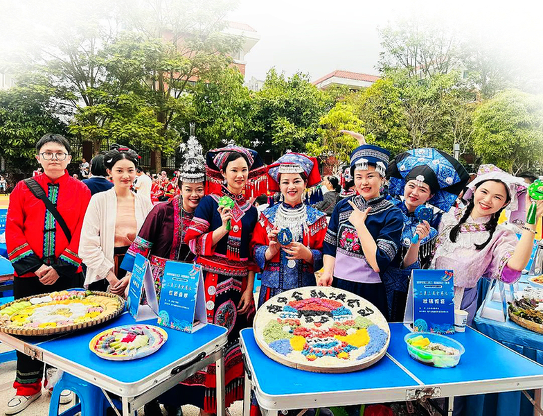 3月28日,蟠龙社区举办“嘹啰欢歌三月三 民族团结一家亲”主题活动。图为居民在特色图案的五色糯米饭前拍照打卡。 (蟠龙社区供图) 本报通讯员 赖江梅 韦尹璇 张冠