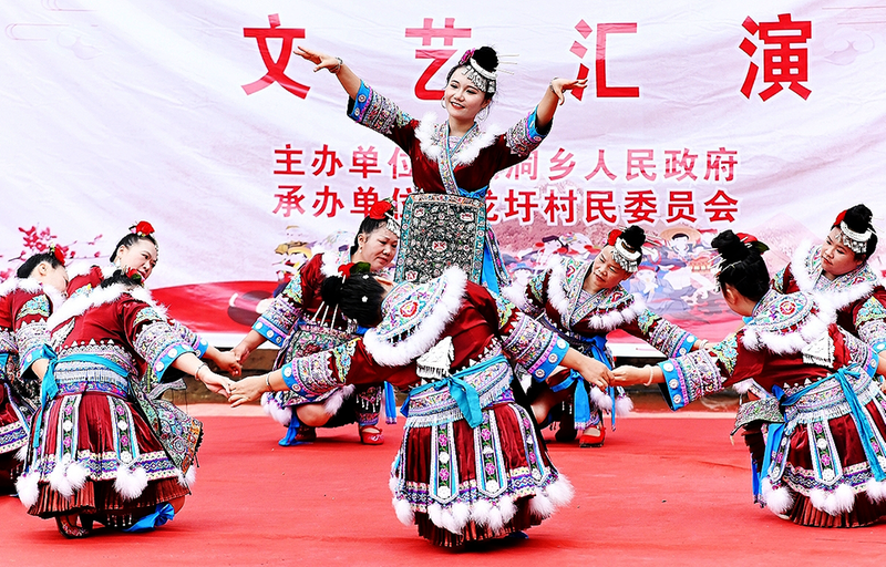 日前,融水苗族自治县拱洞乡龙圩村开展民族舞交流活动,广西三江侗族自治县、融安县和贵州从江县、黎平县的壮汉瑶苗侗等58支舞蹈队伍参加。图为表演者身着绚丽民族服饰竞展舞姿,欢庆即将到来的秋收。 (本报通讯员 兰堃/摄影报道)