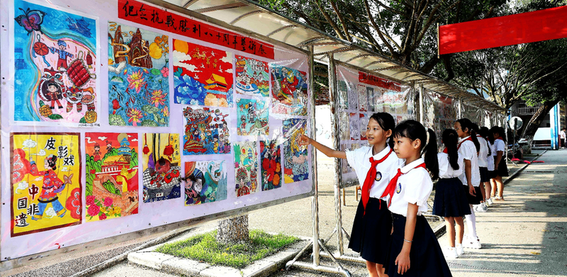 9月1日,柳州市融安县实验小学举行2025年秋季开学典礼。典礼围绕“融登高峰石榴红,县小少年启新程”主题,通过升旗仪式、表彰先进、表演节目《开学啦》等环节,激励学生以新学期为新起点,团结如石榴籽般紧密,秉持勇攀高峰之志,携手拼搏、共同进步。图为学生参观纪念抗战胜利八十周年艺术展。 (本报通讯员 覃庆和/摄影报道)