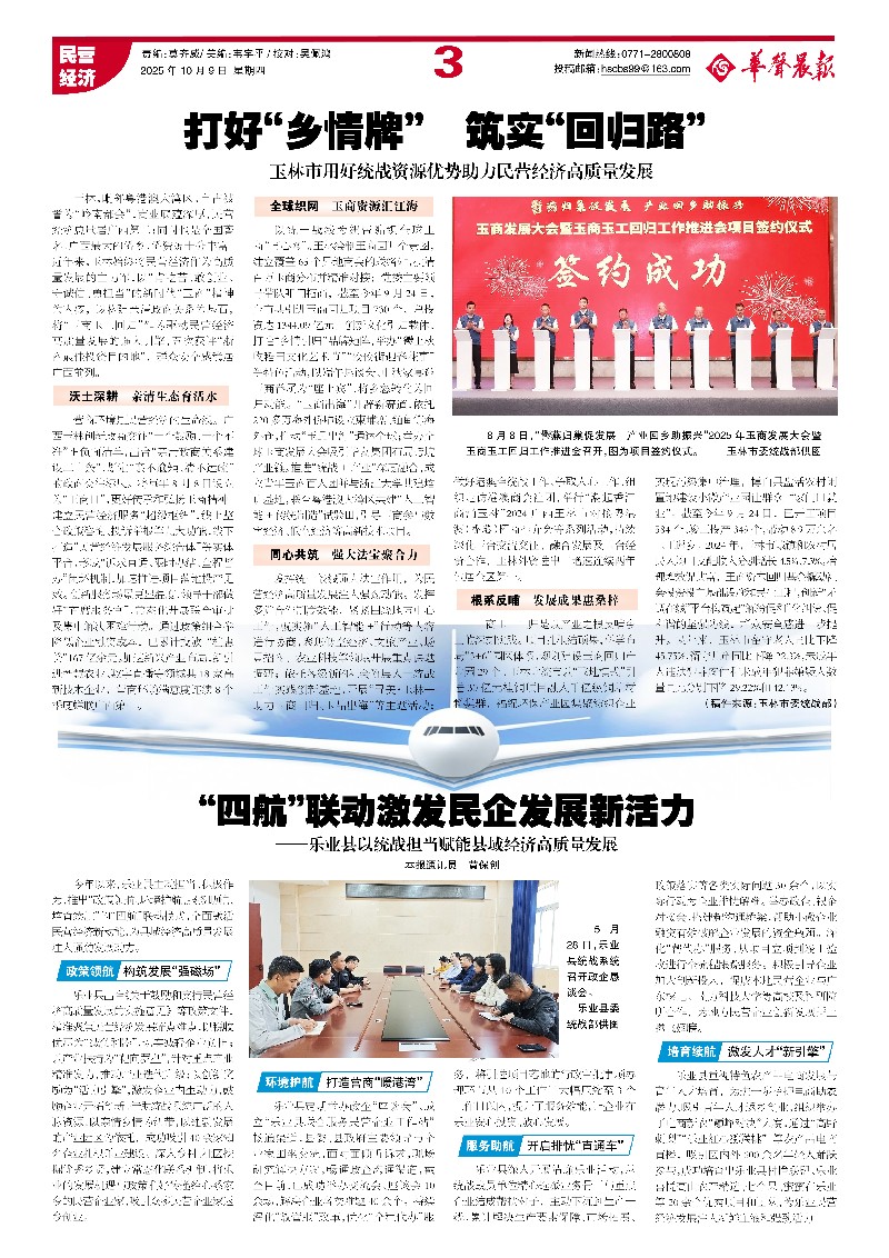 以统一战线为纽带编织全球玉商“同心网”。玉林绘制玉商回归全景图,建立覆盖65个异地商会的联络站,摸清百万玉商分布并精准对接;党委主要领导带队叩门招商,截至今年9月24日,全市共引进玉商回归项目730个,总投资达1344.09亿元。创新文化引归载体,打造“乡情引归”品牌矩阵,举办“鬱上秋收稻田文化艺术节”“佼佼街迎春花事”等特色活动,以端午恳谈会、中秋家宴邀玉商眷属为“座上宾”,将乡愁转化为回归动能。“玉商出海”开辟新赛道,依托220多万海外侨胞设立柬埔寨、缅甸等海外仓,推动“玉品出海”通达全球;举办全球玉商发展大会吸引华友集团布局跨境产业链。推进“统战+产业”深度融合,成立青年玉商百人团并与浙江大学共建培训基地,联合粤港澳大湾区共建“人工智能+传统制造”试验田,引导玉商参与数字经济、低空经济等高新技术项目。