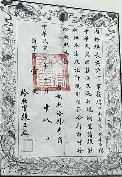 台湾爱国志士林资铿是台湾被日本窃据后第一位恢复中国国籍的台湾同胞。图为林资铿恢复中国国籍证明。 “日本台籍人林季商……呈请复籍,核与本法及施行规则相符合,行许可发给执照为凭。”