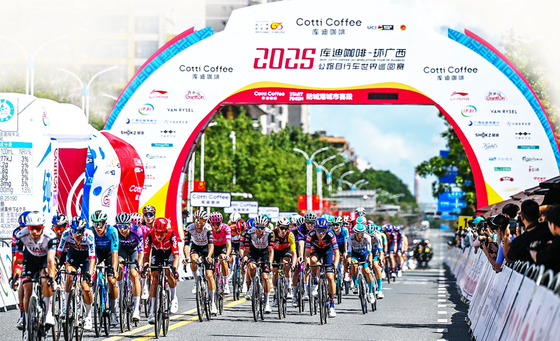 本报讯 (记者莫齐威)10月14日,2025环广西公路自行车世界巡回赛在防城港开赛,来自世界各地的20支顶级车队参赛。此次赛事共设6个赛段,总竞赛距离1017.1公里,路线串联防城港、崇左、百色、河池、来宾及南宁等地,将广西的滨海景致、喀斯特奇景、浓郁民族风情与厚重红色文化深度融合。