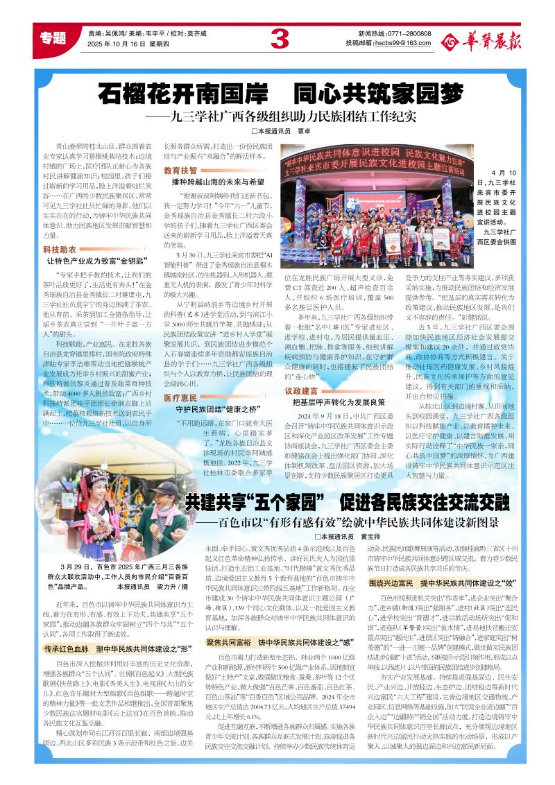 从宁明县峙浪乡等边境乡村开展的科普(艺术)进学堂活动,到与滨江小学3000师生共跳竹竿舞、共抛绣球;从民族团结政策宣讲“进乡村入学堂”凝聚发展共识,到民族团结进步模范个人石春媚连续多年资助都安瑶族自治县的学子们……九三学社广西各级组织与个人以教育为桥,让民族团结的理念浸润心田。