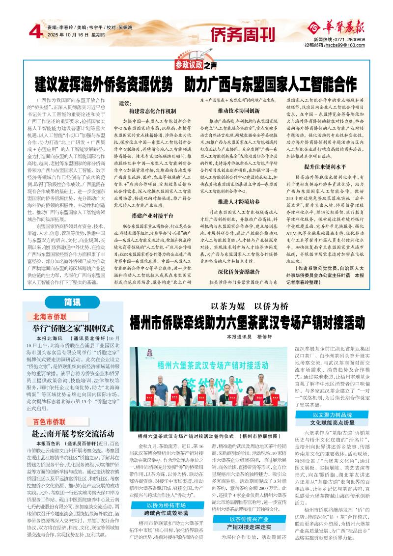 本报百色讯 (通讯员百侨轩)近日,百色市侨联赴云南省文山州开展考察交流。考察团在砚山县江娜镇书院社区“侨胞之家,了解其在搭建为侨服务平台、优化服务流程、切实维护侨益等方面的创新举措与成效。通过走访稼衣镇侨园社区以及平远镇富侨社区、和侨社区,考察挖掘侨乡文化资源、推动特色产业发展的成功实践。此外,考察团一行还实地考察天保口岸为侨服务工作站、砚山中医医院康养中心及云南七丹药业股份有限公司,参加座谈交流活动。两地侨联召开专题座谈会,围绕拓展海外联谊、涵养侨务资源等深入交流探讨,并签订友好合作协议,双方将在经济、科技、文化、联谊等领域加强交流与合作,实现优势互补、互利共赢。