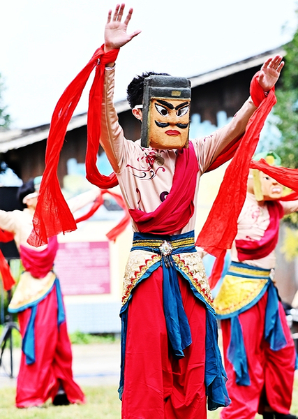 10月25日,柳州市2025年“旅游促进各民族交往交流交融计划·桂在行动”交流活动暨柳城县古砦仫佬族乡“稻美古砦·甜野乡村”生态文化旅游节,在柳城县古砦稻花飘香景区开幕。当地各民族群众以民族服饰走秀、山歌对唱、农产品推介、直播展销等多种形式,全方位展现古砦仫佬族乡的民族风情、生态魅力与乡村振兴成果,促进各民族交往交流交融。图为仫佬族傩面舞表演。 (本报通讯员 兰堃/摄影报道)