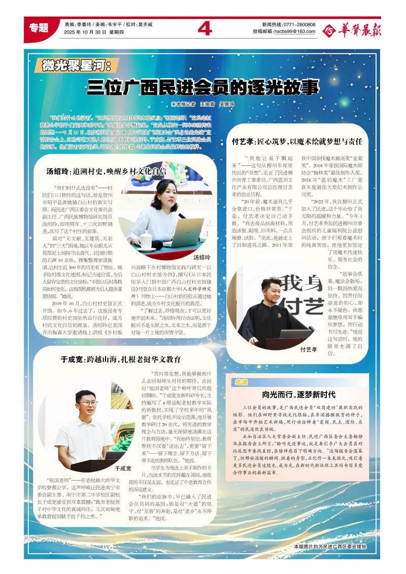 正如自治区人大常委会副主任、民进广西区委会主委杨静华在报告会上所言:“聆听先进事迹,就是要引导广大会员在对比反思中查找差距,在榜样感召下明确方向。”这场报告会落幕了,但那些温暖的瞬间、执着的身影,正化作一束束微光,吸引着更多民进会员追随光、成为光,在新时代新征程上共同书写多党合作事业的崭新篇章。