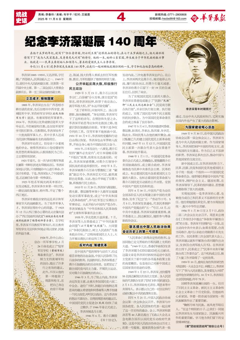 “鞠躬尽瘁为民族,高风亮节昭后人。”在这个特别的日子,让我们一同铭记李济深先生为国家独立、民族振兴所作的重要贡献,学习他为我们留下的宝贵精神财富。