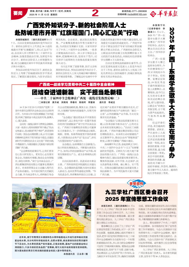 本报防城港讯 (通讯员区统轩)11月7日,自治区党委统战部组织党外知识分子、新的社会阶层人士代表近30人赴防城港市开展“红旗耀国门,同心汇边关”行动,旨在深入学习贯彻中共二十届四中全会精神,加强思想政治引领,发挥党外知识分子、新的社会阶层人士的智慧和力量,助力边疆地区铸牢中华民族共同体意识和乡村振兴。