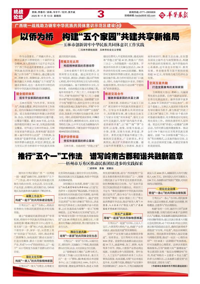 作为全国著名、广西最大侨乡,玉林市认真学习贯彻党的二十届四中全会精神,深入贯彻落实习近平总书记关于广西工作论述的重要要求,以铸牢中华民族共同体意识为主线,创新实践“以侨为桥”工作路径,通过健全组织、深耕文化、保障权益、深化合作、互嵌共融五大举措,构建起“五个家园”共建共享格局,走出一条具有侨乡特色的铸牢中华民族共同体意识实践路径。