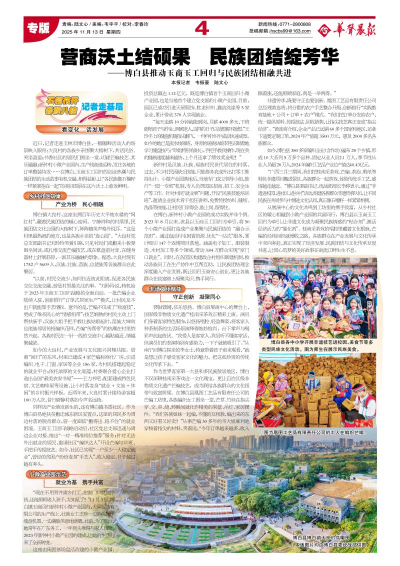 从展演中心的文化共鸣到工坊里的携手致富,从乡村社区的暖心相融到小微产业园的共富同行,博白县以玉商玉工回归为牵引,让非遗文化成为凝聚民族情感的“粘合剂”、激活经济活力的“催化剂”。桂南采茶戏的唱腔里藏着文化根脉,芒编的经纬间织就增收之路,各族群众在产业发展与文化传承中双向奔赴,真正实现了经济发展、民族团结与文化传承互促并进,让同心筑梦的美好故事在南流江畔生生不息。