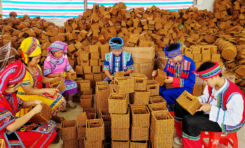 “以前,村民交流少,如何拉近彼此距离,促进各民族交往交流交融,曾是村里最关注的事。”刘玲玲说,转机始于2023年玉商玉工回归战略的全面启动。一批芒编企业陆续入驻,创新推行“订单式居家生产”模式,让村民足不出户就能靠手艺增收。意外的是,芒编不仅成了“致富技”,更成了维系民心的“情感纽带”:技艺娴熟的村民主动上门帮扶新手,汉族大姐手把手教壮族姑娘起针,苗族大婶向仫佬族邻居传授编织花样,芒编“传帮带”的热潮在村里悄然兴起。各族村民在一针一线的交流中心越贴越近,情越聚越浓。