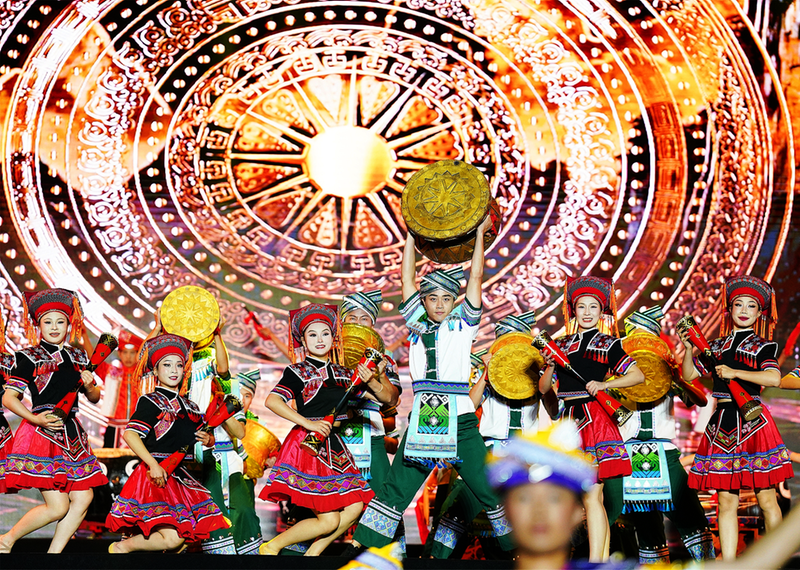 11月14日,第二十三届河池铜鼓山歌艺术节在河池市金城江区开幕。据悉,本届艺术节以“神韵河池 活力金城”为主题,精心组织文艺展演、非遗展示、山歌擂台、书画摄影等系列活动,立体呈现河池的山水神韵与民族风情,推动传统文化在守正创新中绽放时代光芒。图为舞蹈《鼓韵千年》。