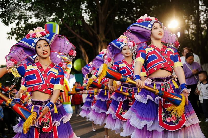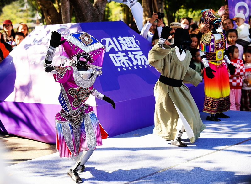 身着民族服饰的人工智能机器人正在舞台上表演。