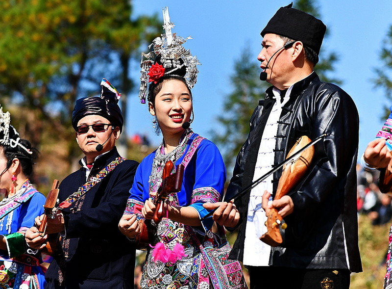12月15日,三江侗族自治县林溪镇举办第六十五届民族传统“花炮节”,桂湘毗邻各民族群众以抢花炮、放土炮、非遗巡游、琵琶多耶、文艺展演等多彩活动,吸引数万民众和各地游客观赏体验。近年来,当地以节为媒,通过农文旅融合,推动旅游业持续发展。图为当地群众在表演节目。 本报通讯员 兰堃/摄