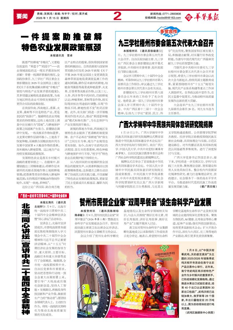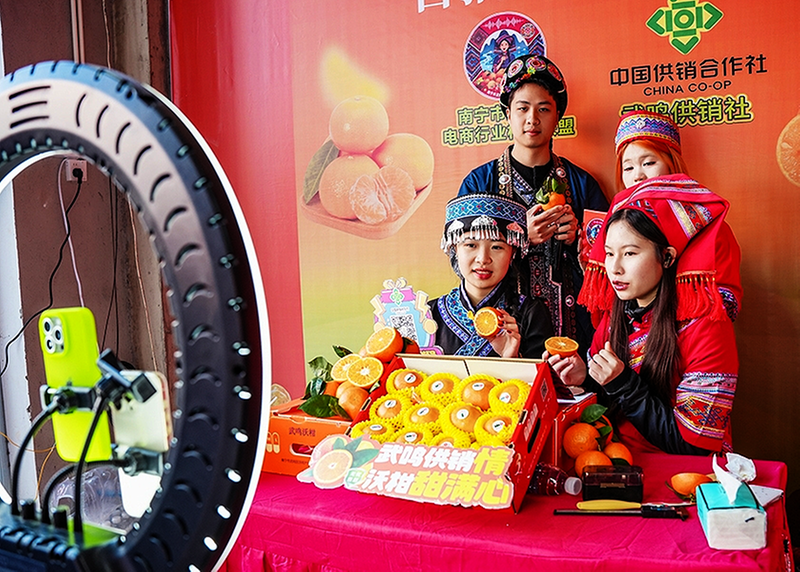 1月8日,以“中国沃柑看武鸣,沃的感觉真好”为主题的2025/2026年销售季武鸣沃柑开市活动在南宁北农产品交易中心举行。近年来,南宁市武鸣区将沃柑特色产业作为乡村振兴的重要抓手,已形成规模化发展格局。通过推进水果出口试验区建设,培育40个出口认证果园和30家出口包装厂,武鸣沃柑已远销加拿大、俄罗斯等28个国家,年出口量稳定在20万吨以上。图为活动现场在进行电商直播。